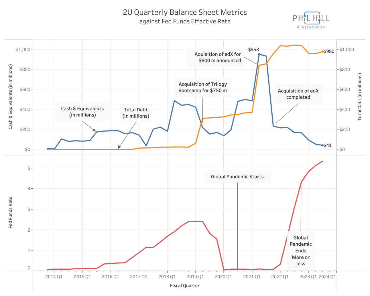 Note the Federal Funds Effective Rate in red. What is most important is that it started rising - dramatically - two quarters after the completion of the edX acquisition. While this rate is not the same as a corporate term loan rate, it drives much of the cost of borrowing. Loans got much more expensive starting in 2022.