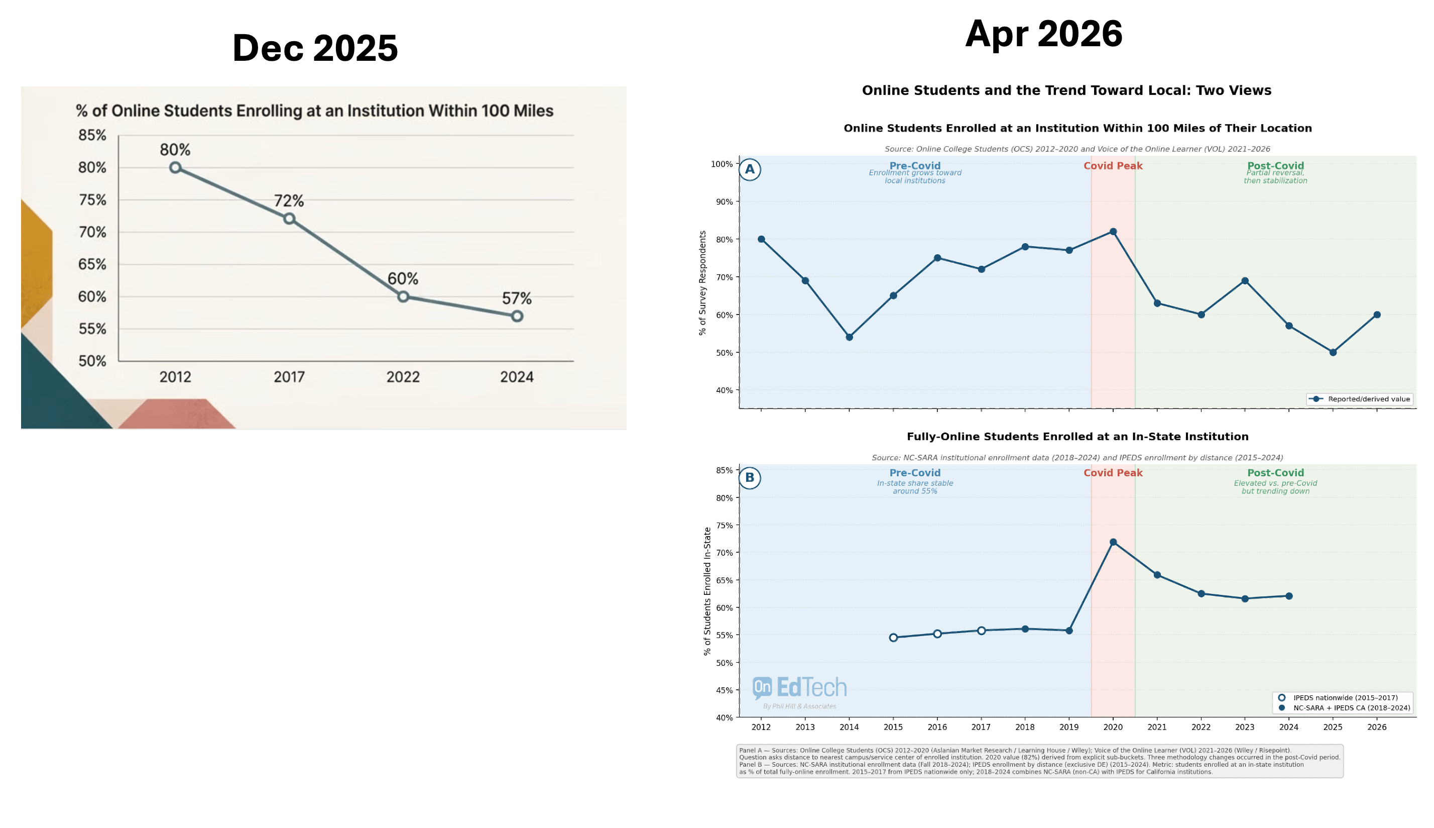 The locality analysis required something that was genuinely beyond what I could reliably do in December: combining multiple independent datasets—VOL survey reports across 14 years, NC-SARA institutional enrollment data, and IPEDS nationwide figures—into a coherent analytical framework with charts precise enough to publish. The December attempt with NotebookLM collapsed on a simpler version of that problem. Last week it worked.