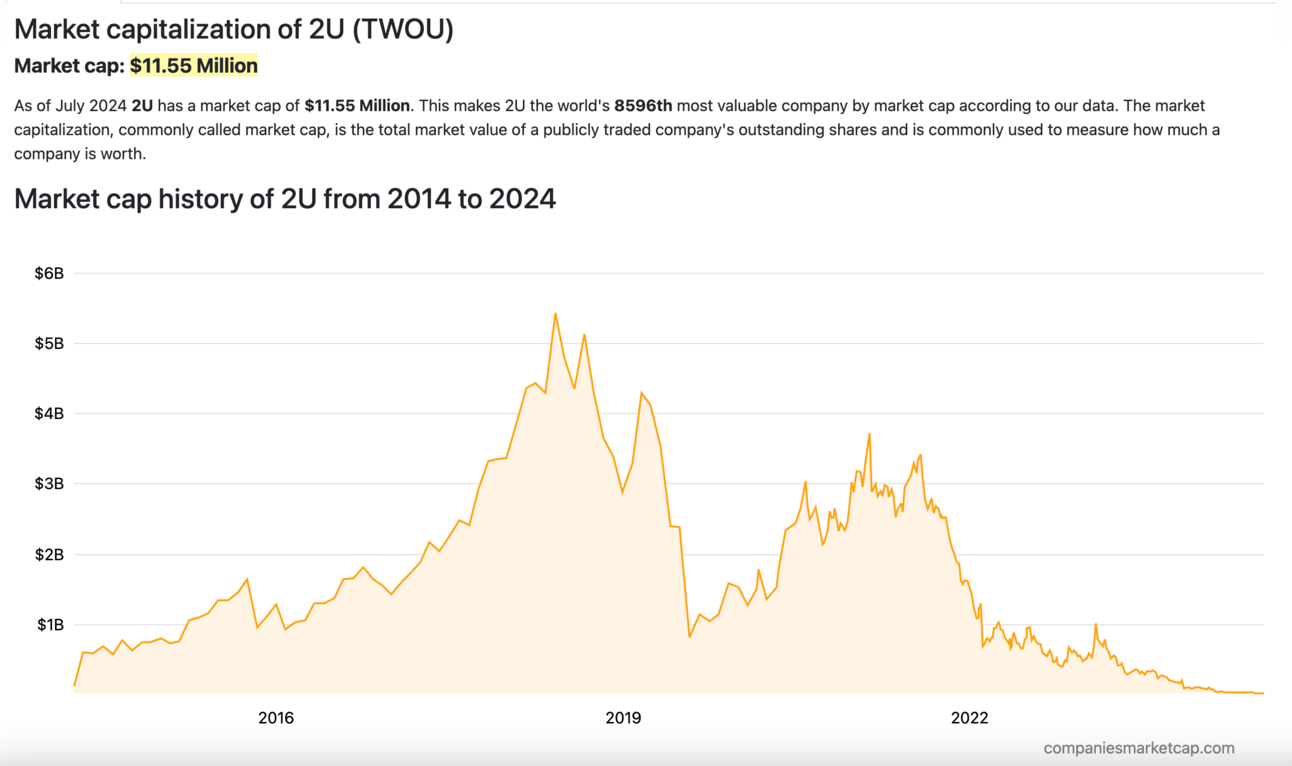 2U - once valued at nearly $5.5 billion as the dominant Online Program Management (OPM) provider - announced that it has filed for Chapter 11 bankruptcy with a voluntary prepackaged deal. What this means is that the company’s debt and ownership structure will be changed, but it will continue to operate and is likely to emerge from bankruptcy as soon as September 2024.