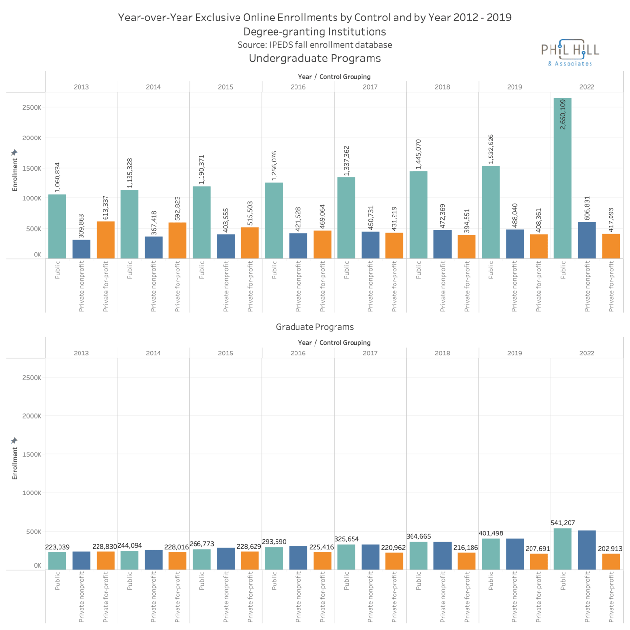 Morgan shared a view of exclusive DE enrollments by degree type and by control (public vs. private nonprofit vs. private for-profit). With the Fall 2022 we can extend that view while still hiding 2020 - 2021 to better see long-term trends.