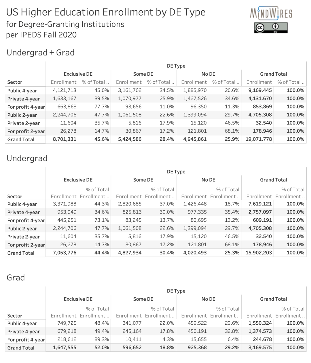 This release is earlier than the typical December or January schedule, and it has a huge caveat: the IPEDS data definitions do not have adequate methods to handled emergency remote education, where traditional face-to-face coursework was forced online, or went back-and-forth as schools tried to manage the pandemic effects. This post by WCET is the best source to understand the changes and guidance issued by the Department of Education. For the profile below, which uses the EF Fall survey component on courses, schools were expected to classify a course as online (distance education, or DE) if it was entirely delivered in the Fall 2020 term online, even if that was part of an emergency response. If a course started in-person then shifted online, it should have been classified as not online (not DE). The caveat is that schools often lacked a method to handle this emergency reclassification and the resulting complications of data collections. We do not know the level of accurate reporting in this regard, but it has to be less accurate than pre-pandemic. Focus on the big picture and not the details for this year’s report.