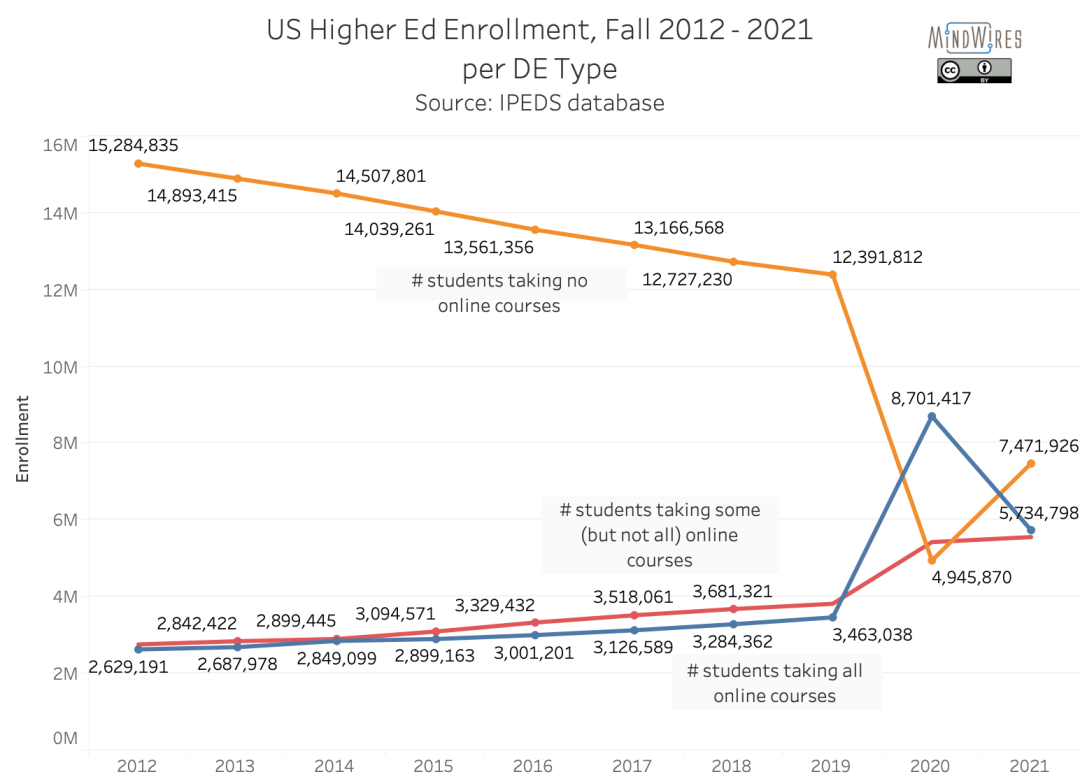 Like last year the headline story is somewhat predictable, as schools were rushing into the new normal by ditching emergency remote teaching, for the most part. Total enrollments decreased (from 19.1 million to 18.8 million), Exclusive DE enrollments significantly decreased (from 8.7 million to 5.7 million), Some DE enrollments increased (from 5.4 to 5.6 million), and No DE enrollments significantly increased (from 4.9 million to 7.5 million). There was fewer online enrollments, but the numbers were significantly higher than per-pandemic numbers. For Fall 2021, 31% of students took all of their courses online, 30% took some of their courses online, and 40% took no online courses (numbers do not add to 100% due to rounding). By way of comparison with Fall 2019, those numbers were 18%, 20%, and 63%.
