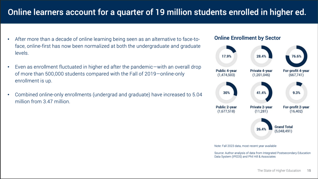This week Jeff Selingo released a “State of Higher Education 2025” slide deck in the form of the infamous Mary Meeker series. And it is useful and well done. The slide deck addresses a number of key drivers of today’s state of higher education, combining useful context in text along with charts, including this one derived from On EdTech.
