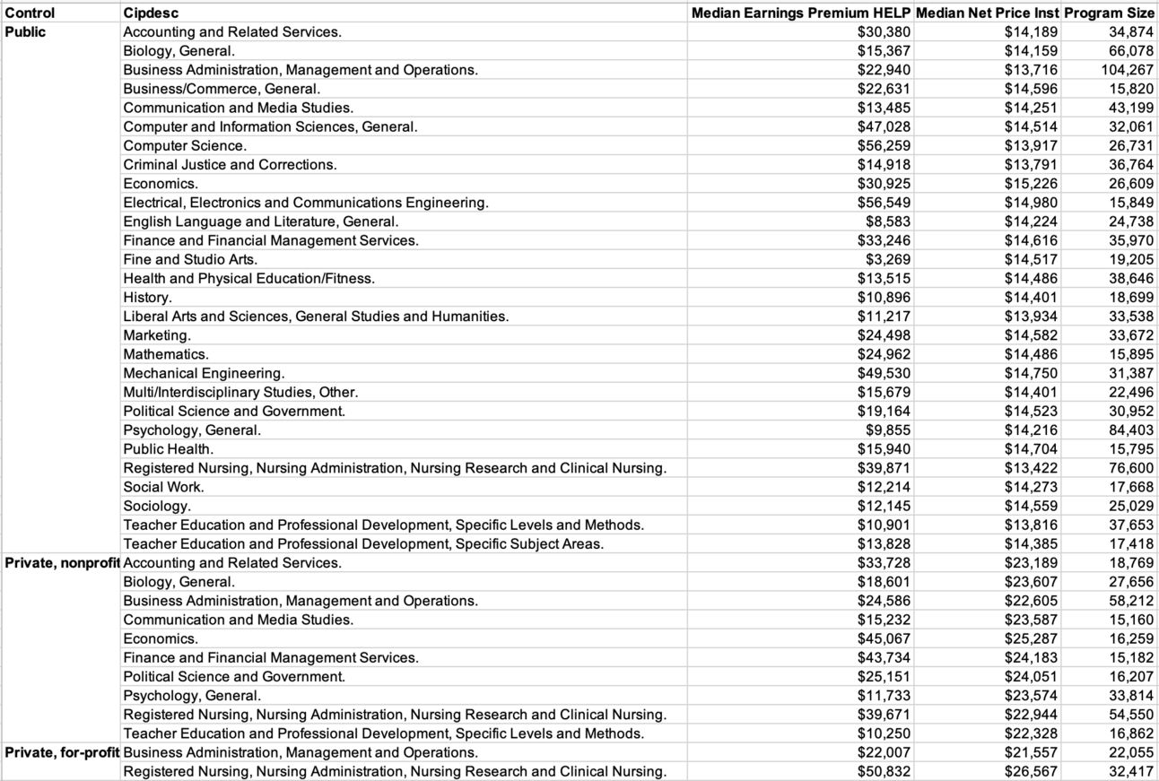 For example, yesterday I shared this chart showing the median performance of each major (i.e., a specific CIP4 code) for Bachelor’s degree programs against the completers’ portion of the HELP Earning Premium metric.
