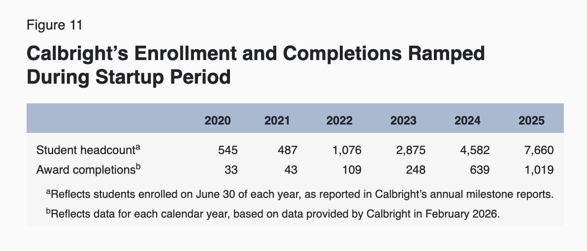This week the Legislative Analyst Office (LAO) gave a report on Governor Newsom’s proposed 2026-27 budget as it relates to the community colleges, including his proposal to increase ongoing Calbright funding from $15 million / year to $53 million / year. That is a major increase. The question is whether Calbright has shown enough progress to justify it.