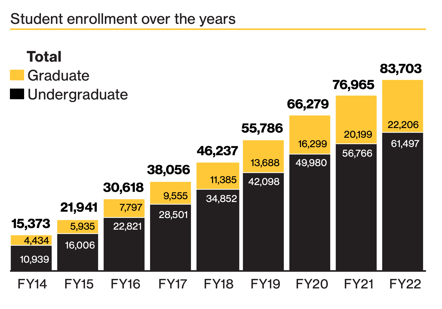 Arizona State University, often cited as the archetype of online scale, is a case in point as seen in this annual report with its dramatic growth in programs and enrollments.
