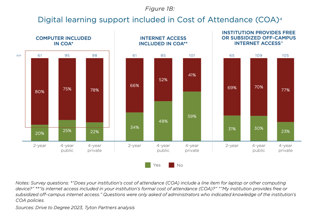 It would have been useful to get a breakdown of this data according to institution type (e.g., 2-year vs 4-year, public vs private, and research-intensive vs comprehensive) as I suspect the differences would be striking. In Tyton’s Time for Class survey provides data on whether digital access is included in the cost of attendance, which gives insight into the problem.