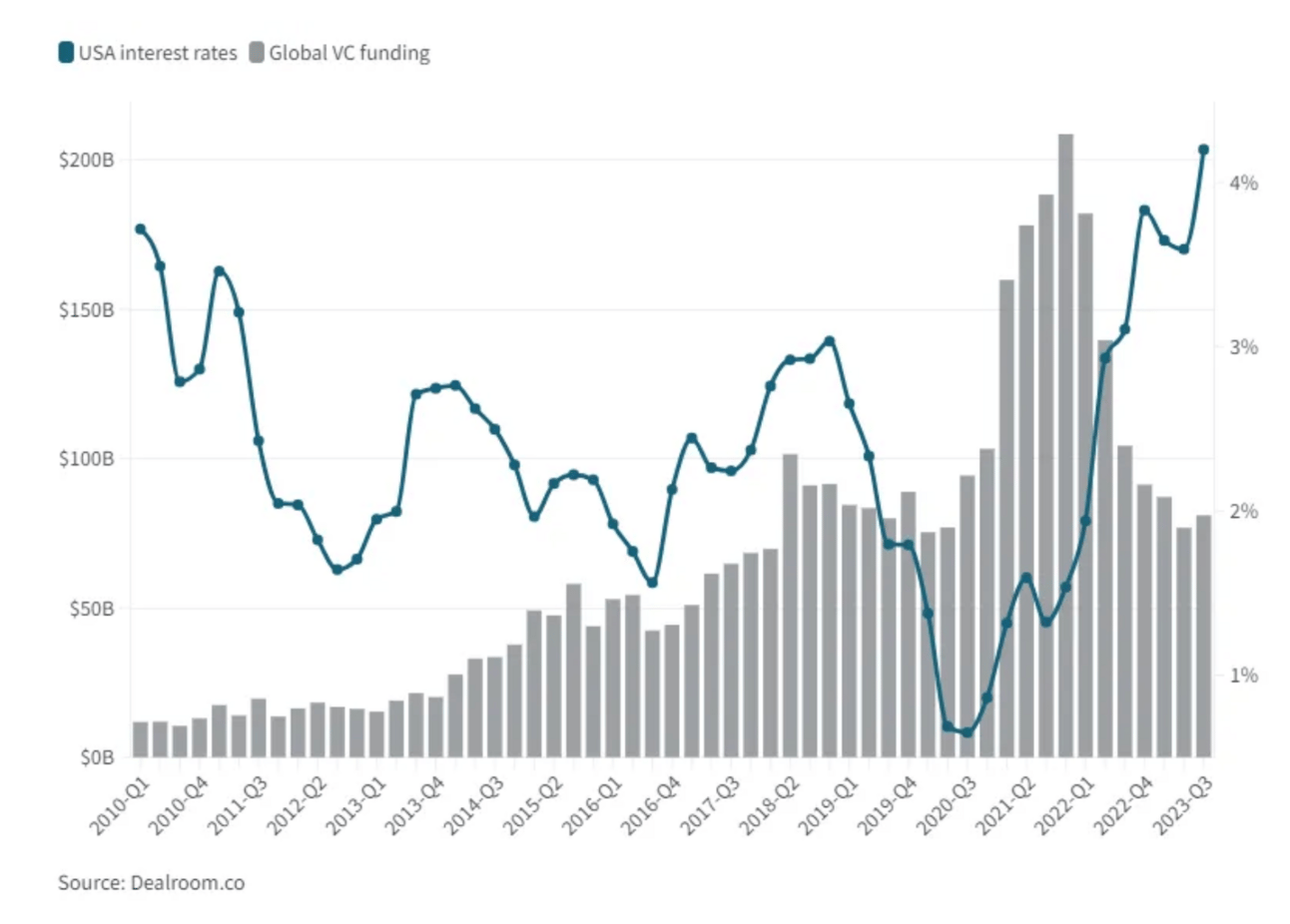 We have seen a decline in VC funding over the past two years. Phil often talks about (and I sometimes listen) about how some of the dynamics in the OPM market are the consequences of there being less cheap money around thanks to rising interest rates. This week I read an analysis of general (i.e., non EdTech) VC funding and interest rates. It occurred to me that our current situation may be closer to a long-term normal. That the burst in VC funding and cheap money we experienced during the pandemic and immediately after were outliers. This is a sobering thought.