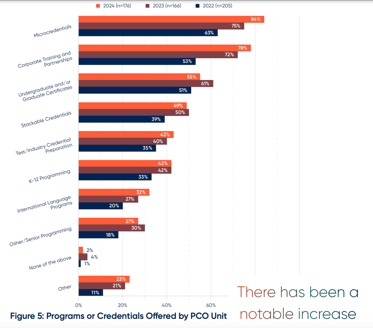 First, there has been a substantial increase in the number of units reporting being involved in or offering microcredentials and corporate offerings.