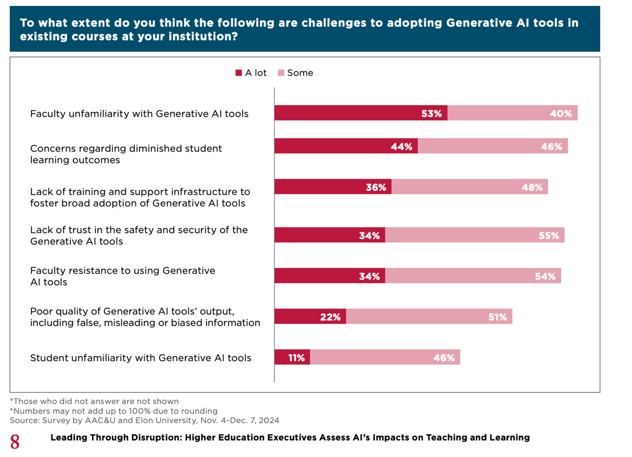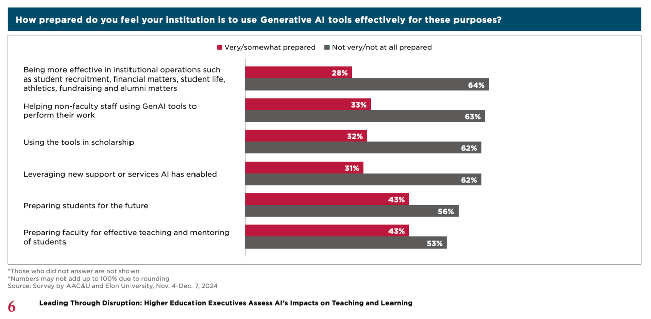 One of the most insightful survey reports this week came from the American Association of Colleges & Universities (AAC&U) in collaboration with Elon University. The survey contains a wealth of interesting information, but the key takeaway for me is the challenge facing higher education leaders as they try to understand AI and integrate it into their institutions.