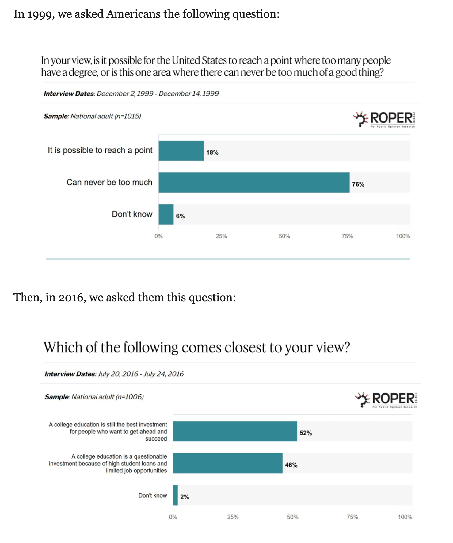 The first question is either poorly framed or intentionally provocative. Either way, the shift in opinions from 1999 to 2016, and likely even further since then, is not a good sign for higher education. Restoring higher education’s standing in public opinion should be a top priority for everyone in the sector right now.