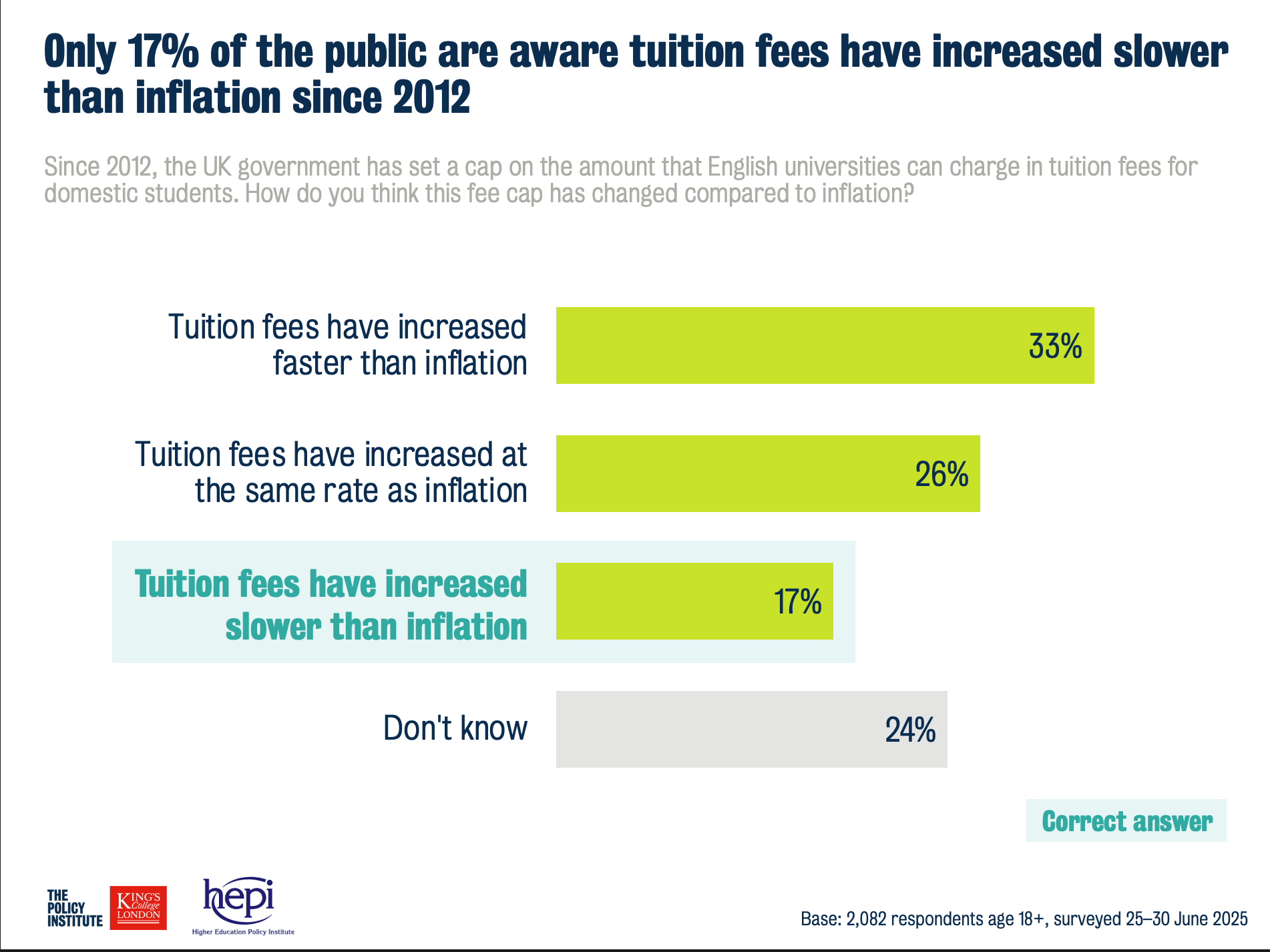 For some time now, even in the US, we’ve been hearing about how tuition fees in the UK have failed to keep pace with inflation. As a result, the real value of those fees has eroded, creating significant financial strain for many higher education institutions. The average member of the public, however, appears far less informed about this reality, with only 17% of respondents guessing correctly.