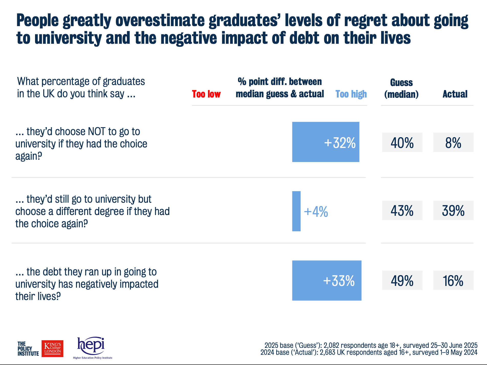 But in the UK, the Higher Education Policy Institute (HEPI) along with the Policy Institute and Kind College London actually got off the couch and ran a similar, fascinating survey. They assembled a panel of over 2,000 adults and asked them some basic factual questions about higher education, then compared the answers with reality. The public got a few things right (such as the proportion of under-30s with degrees), but some of the misperceptions were striking.