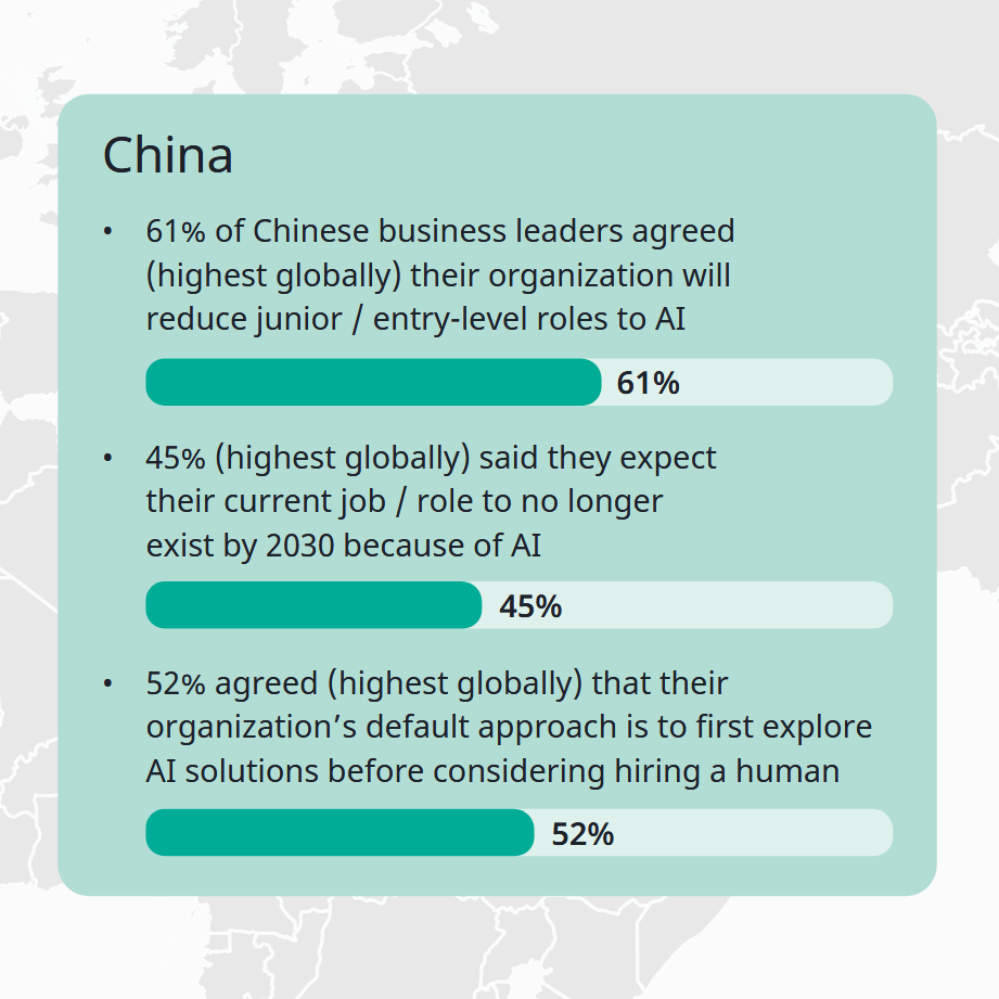 The extent of this trend varies considerably across countries. In China, 61% of businesses say they plan to reduce junior or entry-level roles because of AI, with Australia close behind at 57%.