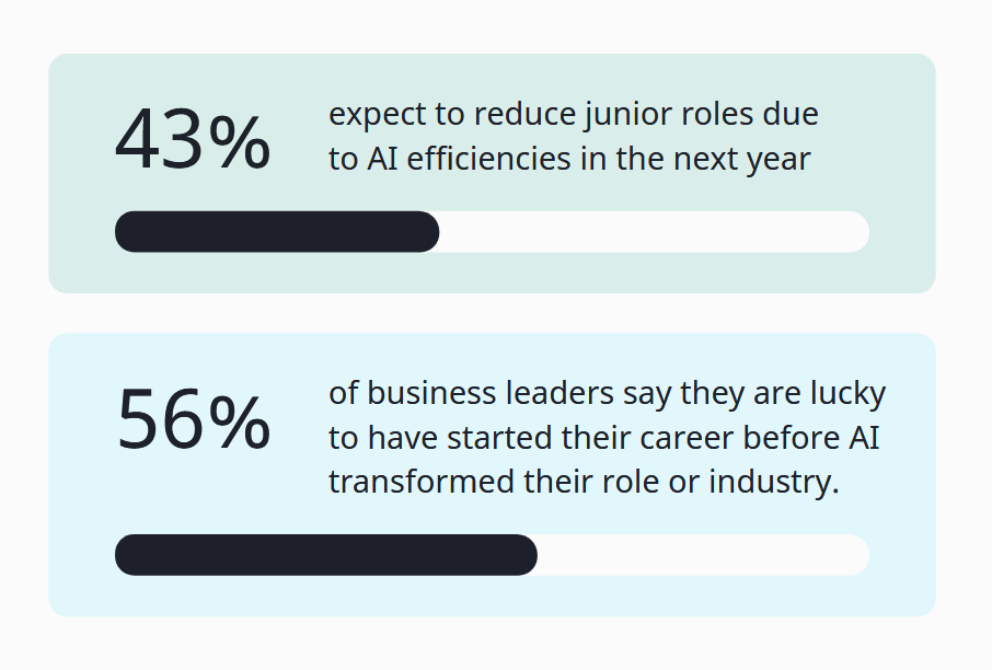 This [replacement of jobs with AI] is most apparent at the start of the career ladder, where a strikingly high proportion (39%) say junior / entry level roles in their organization have already been reduced or cut due to efficiencies made by AI. This can include using AI to conduct research, admin and briefing tasks. And a further 43% expect to reduce junior roles / entry level (either by cutting jobs or reducing recruitment for new starters) due to these efficiencies in the next year.