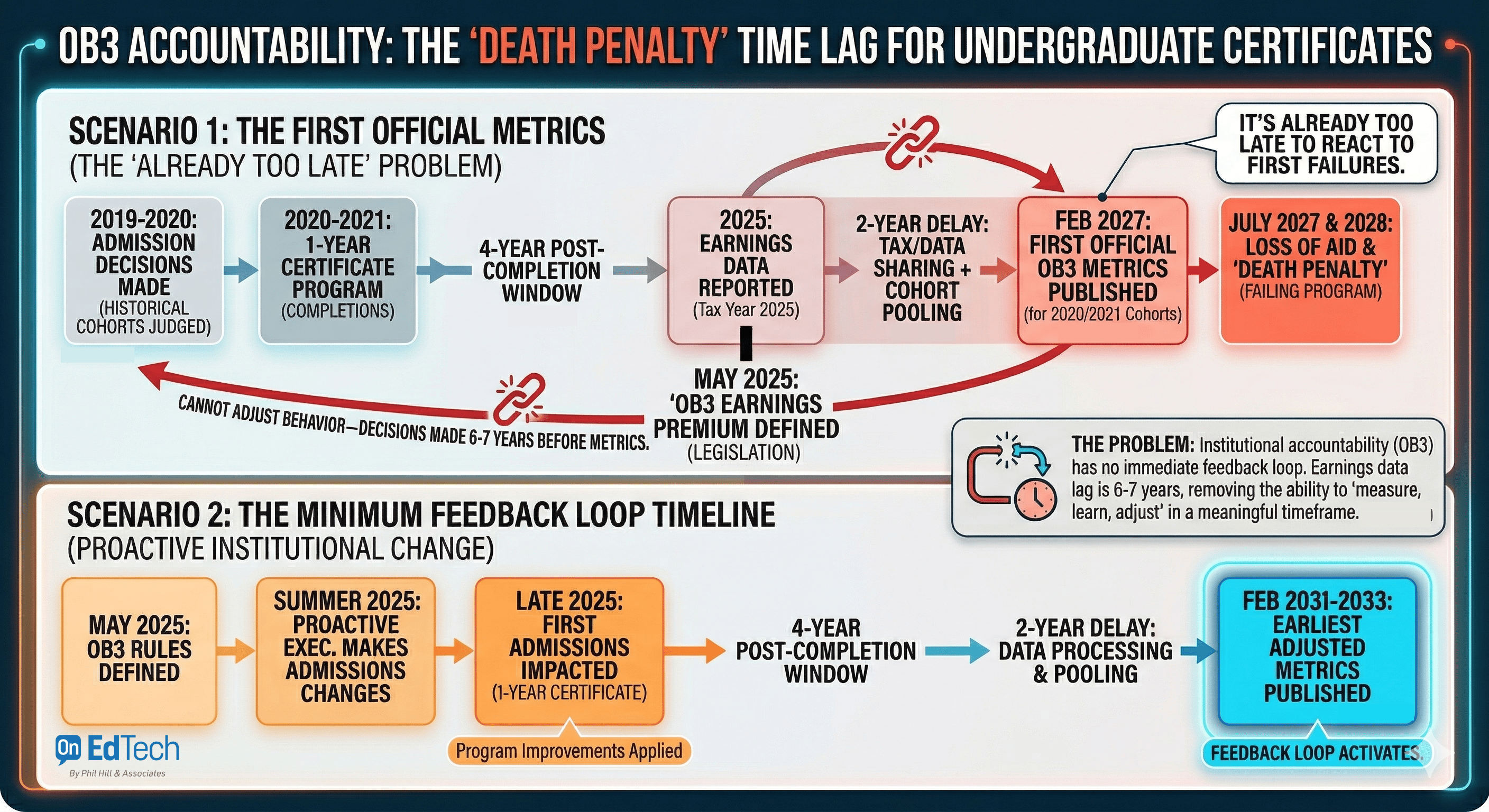 Keep in mind that the metrics were first defined with the OB3 bill that was signed into law July 2025. But until accountability hits a steady state in 2032 and beyond (at the earliest), there is no feedback loop to allow institutions to make changes and improve program performance before losing access to federal student loans.