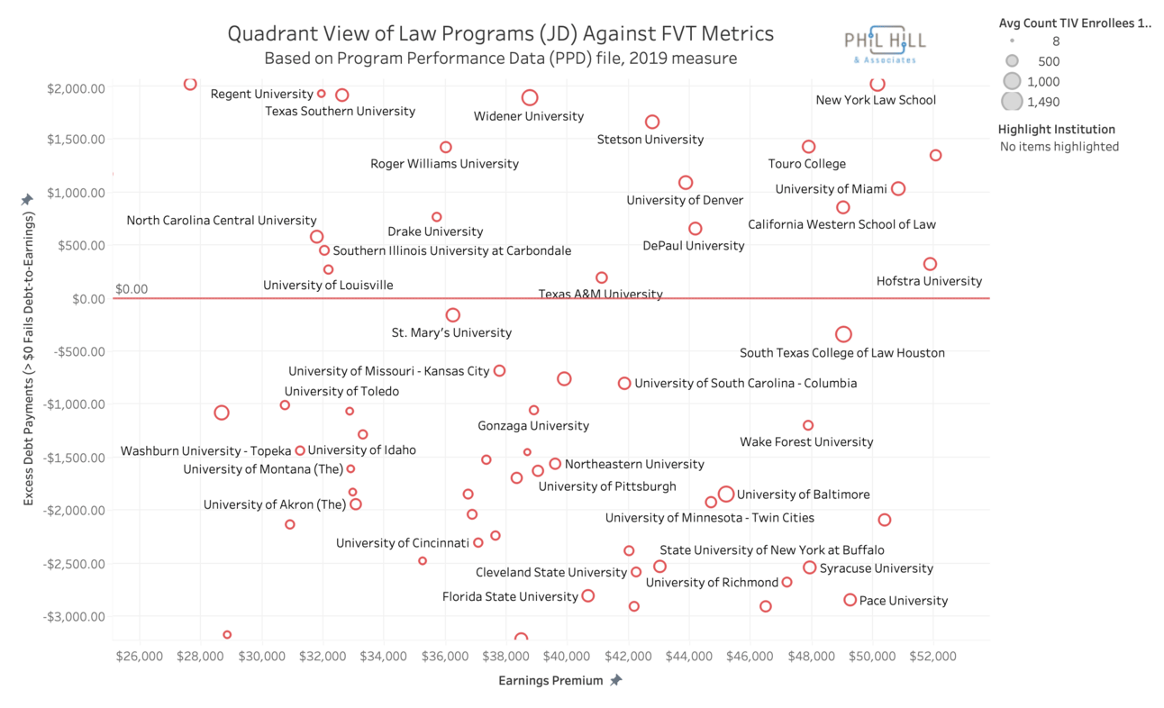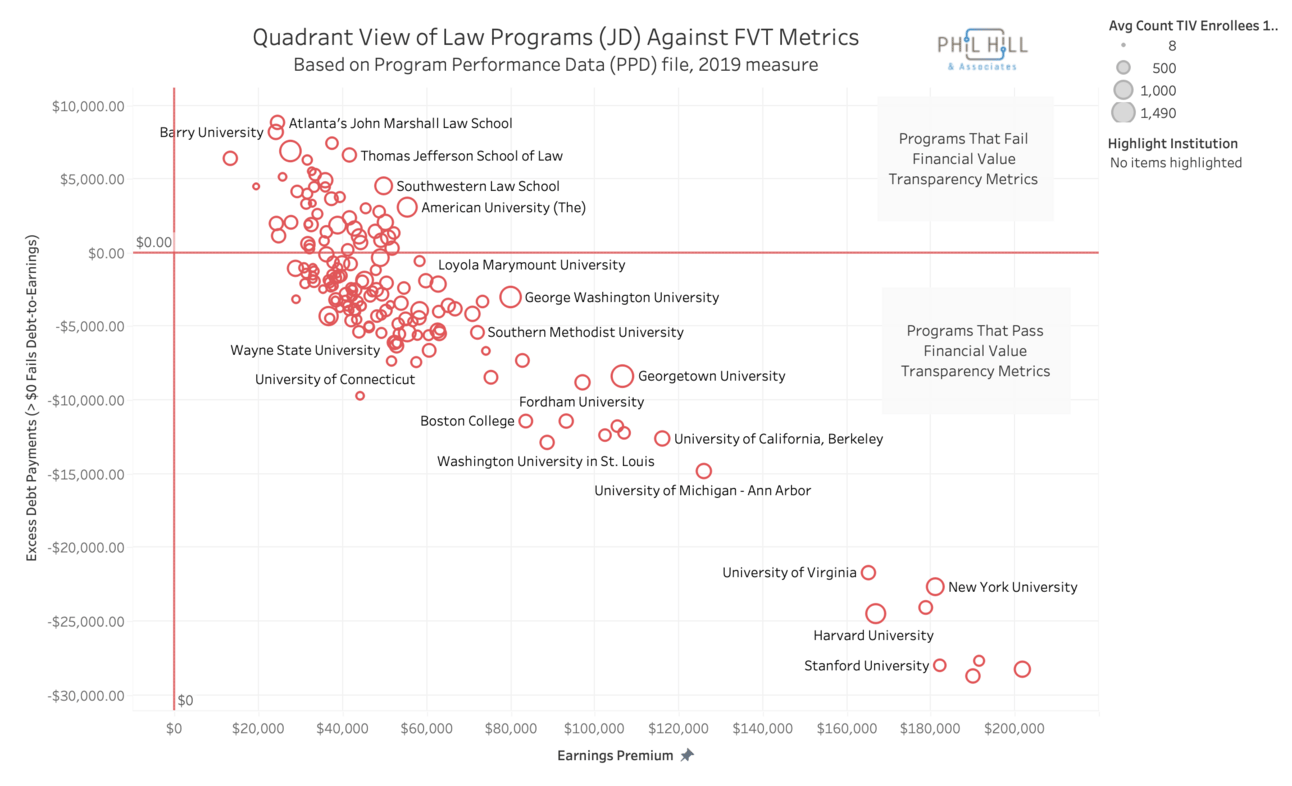 The charts below show how law school JD programs in the US perform against the FVT metrics, using the ED-provided Program Performance Data (PPD) dataset used in GE & FVT rule making. The future values are not yet known, and the PPD values are the best view of these programs assuming no major changes in debt or earnings.