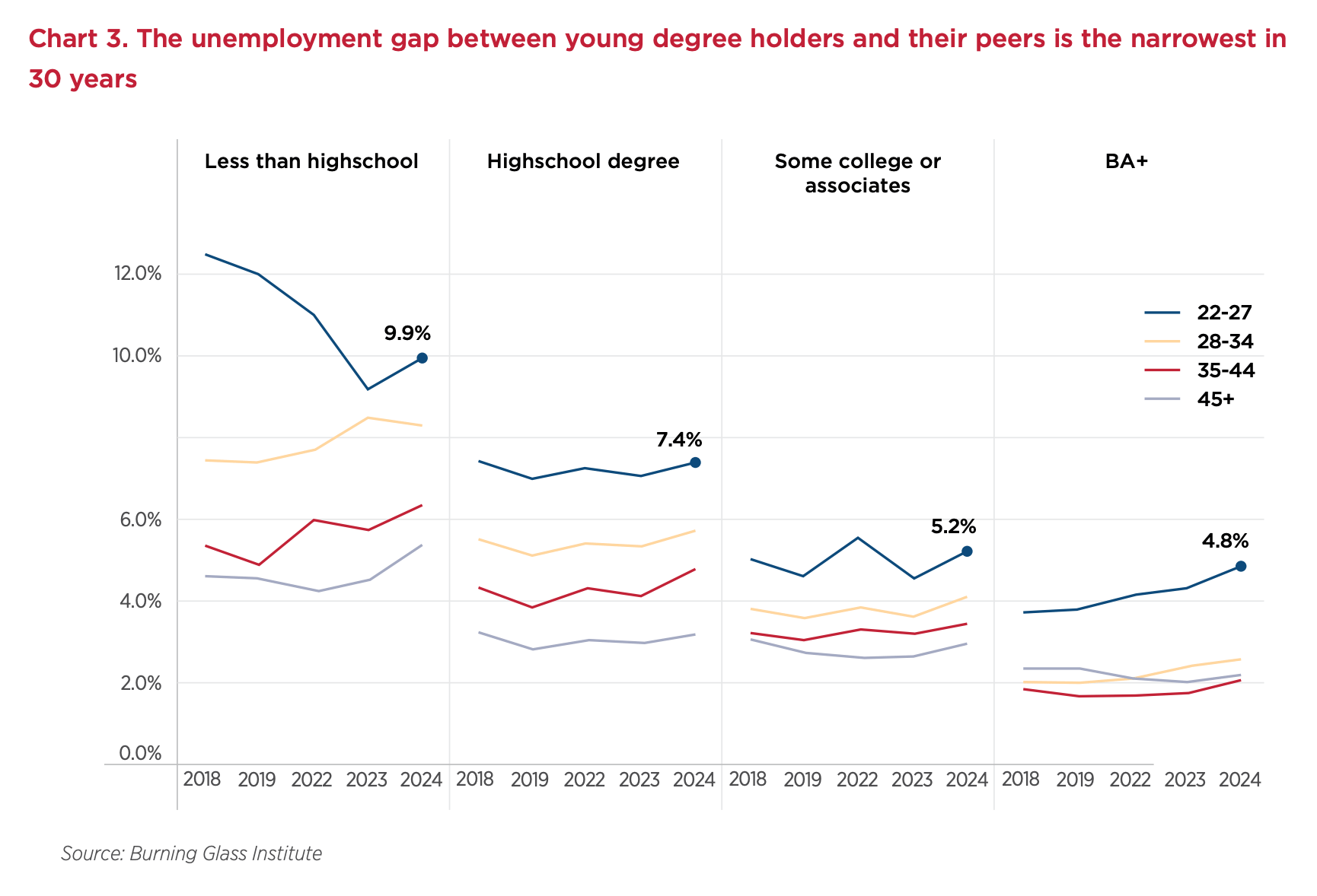 Even Burning Glass’s own report shows a growing gap between young workers’ unemployment rates starting at least in the late 2010s, well before the widespread adoption of Gen AI (look at the rightmost part of the chart).