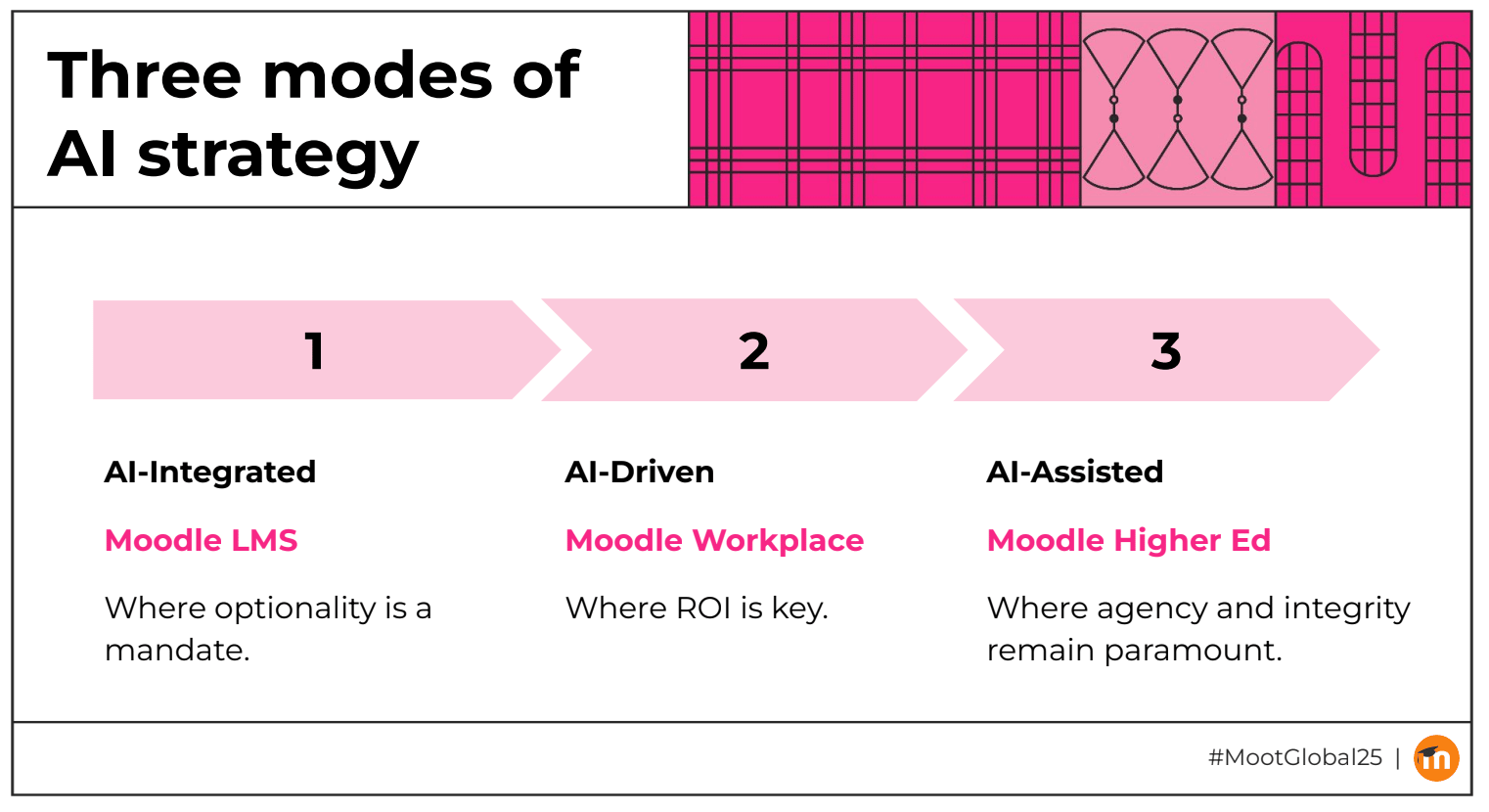 Achour started out by couching the core shift as an approach to AI within the Moodle ecosystem. This is important but it buries the lede a bit. The key point is actually point number three, the announcement of Moodle Higher Ed.