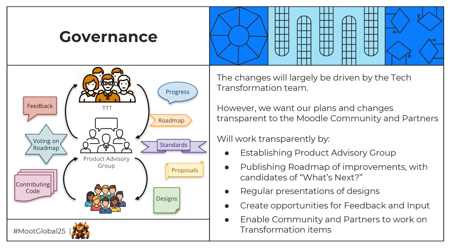 The re-architecture of Moodle will be done in a different manner than typical community structures of the past, led directly by a new Tech Transformation team.
