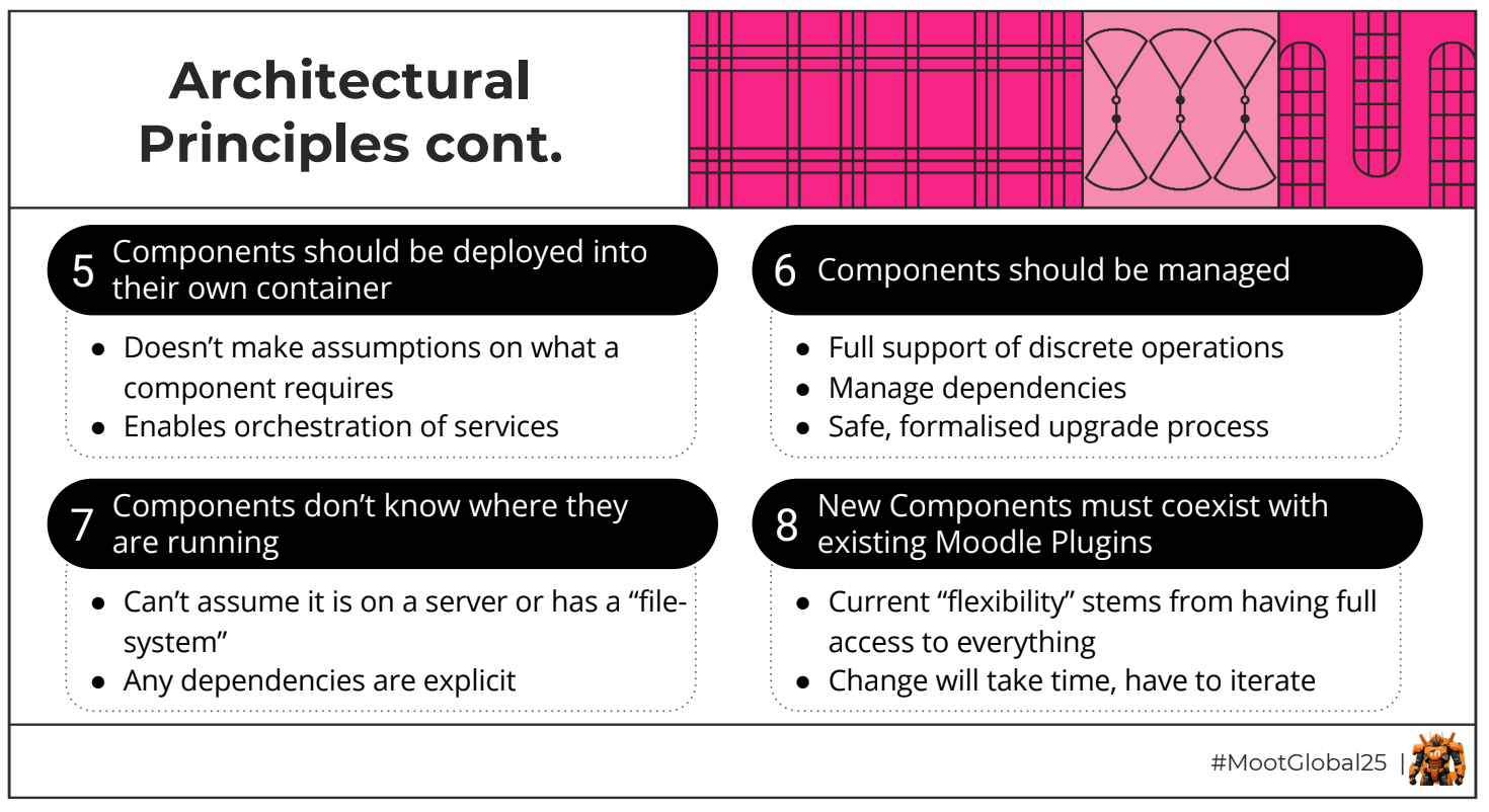 These changes are all important enablers of the move toward premium offerings. But the real change came at the end of the day, from Travis Windsor, the new Director of Architecture and Engineering at Moodle HQ, outlining how the core Moodle platform is going to be rearchitected and how that process will unfold.