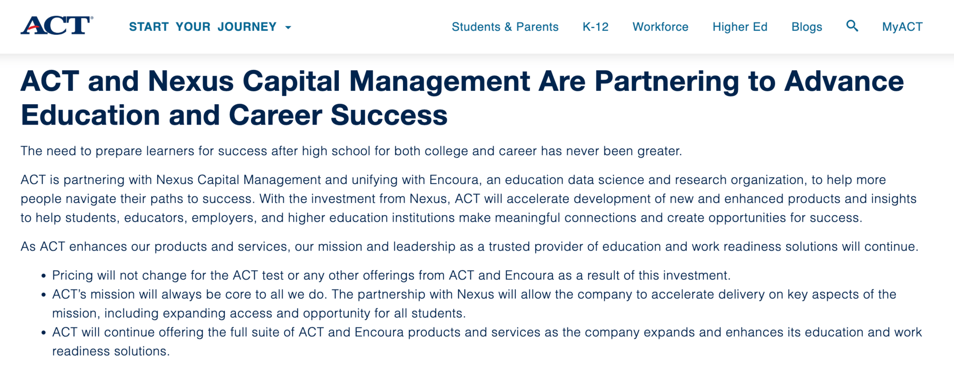 “Our partnership with Nexus Capital Management uniquely positions ACT to meet a watershed moment in our nation, as the demand for talent is growing and becoming more diverse. The need to prepare learners for success after high school for both college and work has never been higher, nor has the need to ensure that every learner has access to equitable college and career planning resources, guidance, and insights,” ACT CEO Janet Godwin said.