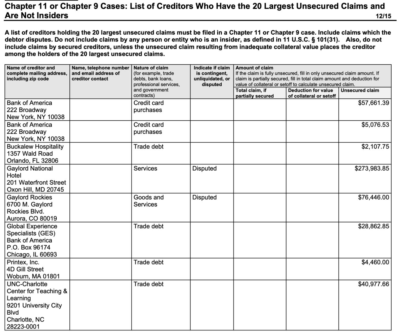 Bigger yet, there are two disputed claims from the Gaylord. $274k from the Gaylord National, site of OLC Accelerate 2023 near DC, and $76k from the Gaylord Rockies near Denver, site of OLC Innovate 2024. The dispute is over these charges that are related to penalties on missing conference minimums.