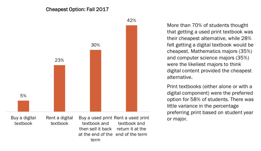 To be clear, I believe the change in pricing levels, removing the $200 or $300 textbooks over time, is a good move, and I believe the move to ongoing updates and revisions not driven by print cycles is also a good move. My concern is that the approach that Pearson is taking ignores student preferences and their long-running choice in finding the best prices for textbooks. Consider these two charts from the National Association of College Stores (NACS) Student Watch survey released last year. 1 The first chart shows (as have many other studies) that students quite often prefer print textbooks over digital.