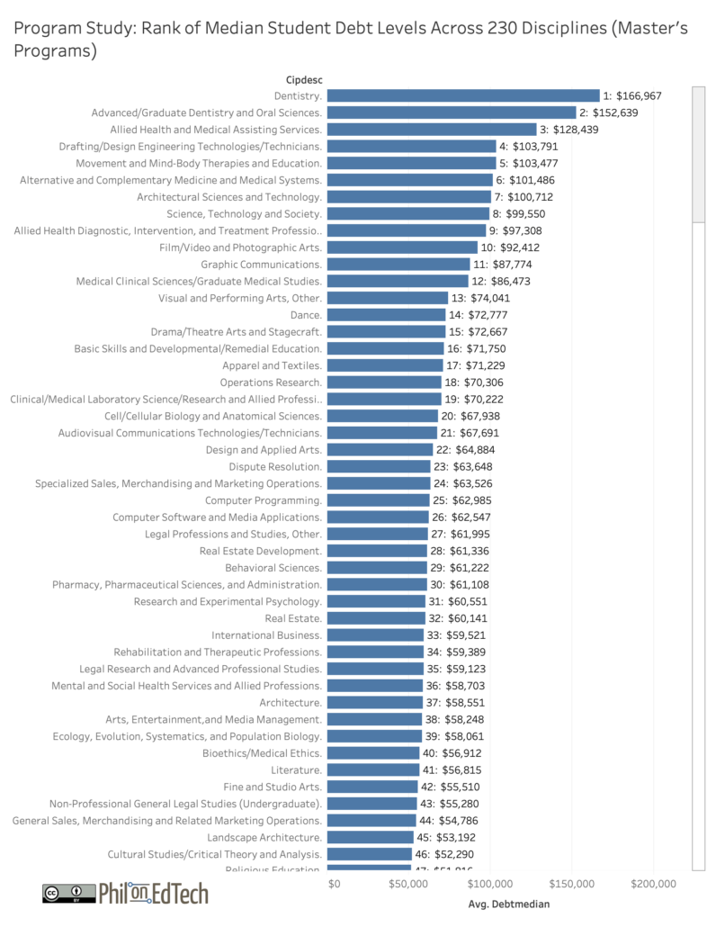 By ranking the master’s level programs across the full data set of roughly 230 disciplines, we get a better general sense of the average debt levels for social work and nursing programs (median by school averaged across all schools with data available for this discipline). Both disciplines appear to be middle of the pack in terms of student debt levels.