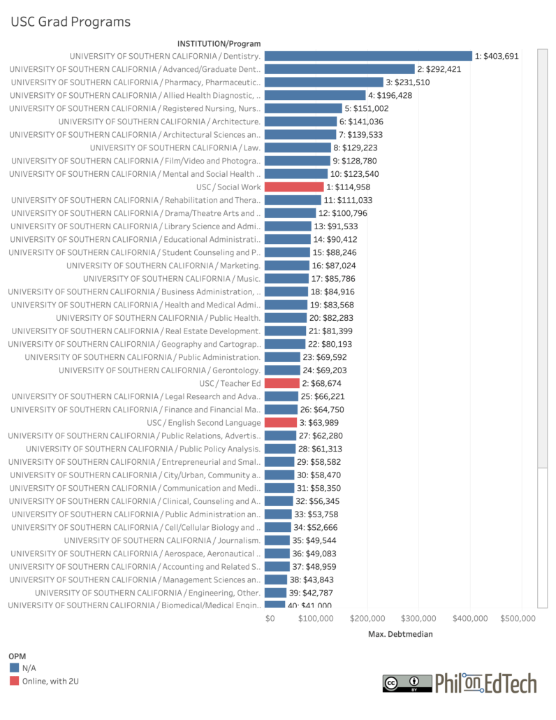 Let’s look at another school that uses 2U as an OPM partner, such as their largest client the University of Southern California. Again, it is not obvious from initial views of the data that the OPM-based nursing programs have higher student debt than others.