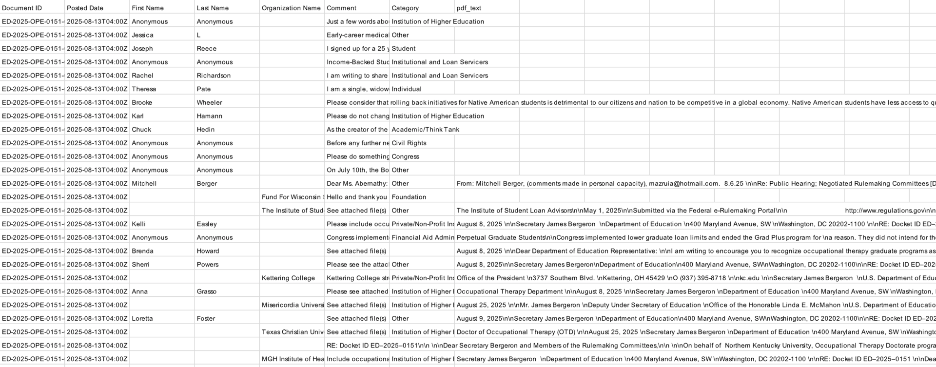 The format for each is a spreadsheet with the Document ID, Posted Date, Name of submitter, Organization of submitter, the text Comment of the submission, the Category of the Organization, and the pdf_text where I extracted the comments from attached PDFs and embedded directly in the spreadsheet (in just over a third of cases, the primary comments were in the attachment, not in the direct submission).