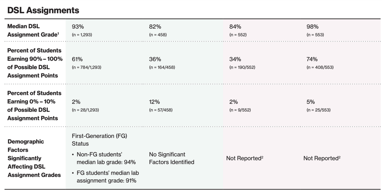ASU made a big bet in Fall 2022, replacing the traditional lab with the DSL version (both campus immersion and digital immersion) for all students, roughly 6,000 - 8,000 per term. The results from Fall 2022 no longer compared to non-DSL labs, but the results continued to improve (note that not all students consented to participating in the study, which is a limitation described in the report).