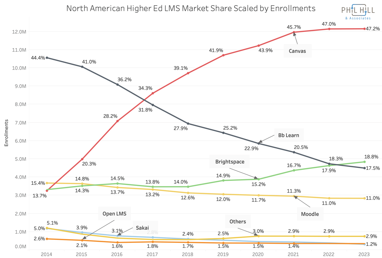 Looking at historical market share scaled by enrollment, which represents how most LMS companies determine their prices for each school, we can see a different picture in terms of market position. The headline this year is that Anthology’s Blackboard Learn, which dominated the market from the early 2000s into the mid 2010s, has now fallen behind D2L Brightspace into third place.
