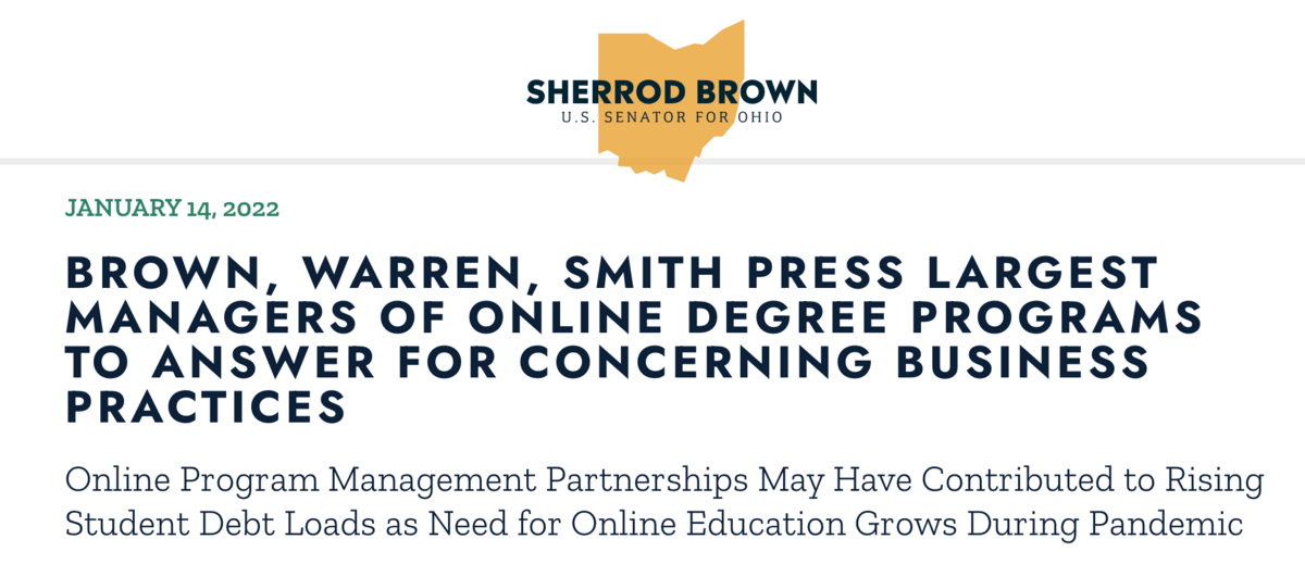 What I think is a better lens to view and understand the conflation of the issues is political in nature. In January of 2020, Senators Warren and Brown issued a letter to five OPM companies asking them to respond to specific questions in the letter. And the letter already had the conclusion in mind.