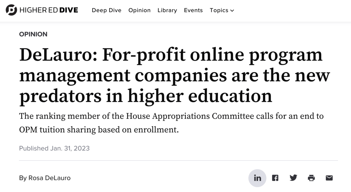 One year later after that (last month), Representative DeLauro explicitly called for the end of tuition revenue sharing agreements by OPM providers.