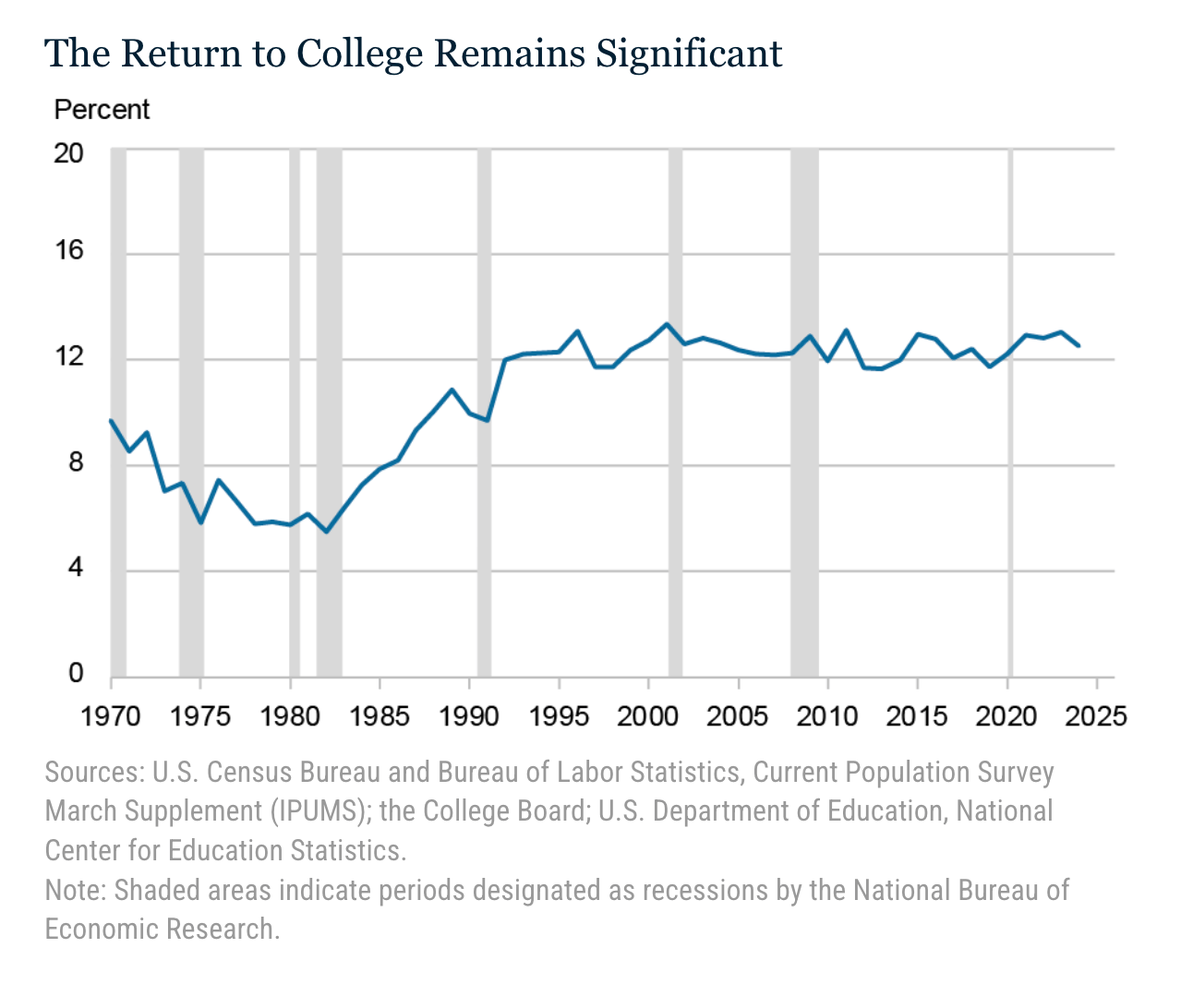 After rising significantly in the 1980s and early 1990s, the return to college has held between 12 and 13 percent for the past three decades and was 12.5 percent in 2024—easily exceeding the threshold for a sound investment. Indeed, by comparison, the stock market has provided a long-term return of about 8 percent and bonds have returned around 4 percent.