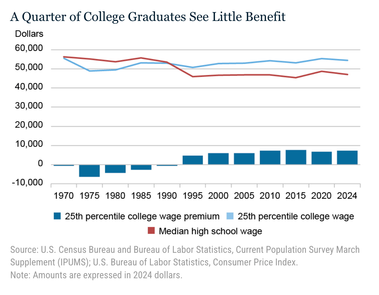 While our baseline estimates focus on the median college graduate, by definition, half of graduates are earning a lower return. Indeed, in the chart below we plot composition-adjusted wages for the 25th percentile of college wage earners compared to the median high school graduate over the past several decades. There is very little difference between the two groups, with an annual college wage premium of well under $10,000. Under our baseline cost scenario, we estimate a 2.6 percent rate of return for the 25th percentile of college graduates in 2024, making college a questionable investment for this group. As we’ve shown before, for at least a quarter of college graduates, college does not appear to pay off.