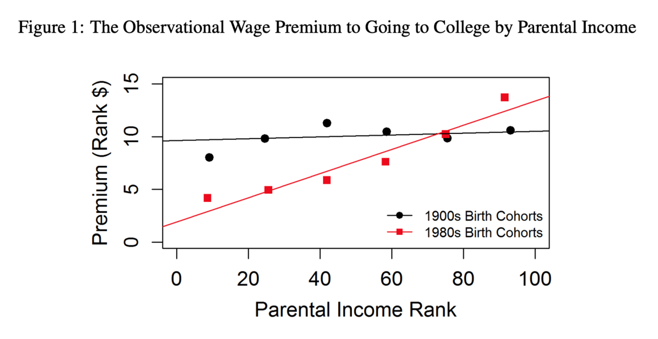 This month two researchers from Princeton and Vanderbilt looked at this question of the college premium for different students, with a focus on low-income to high-income demographics upon entering college. The broad conclusion is that over time higher education has become regressive.