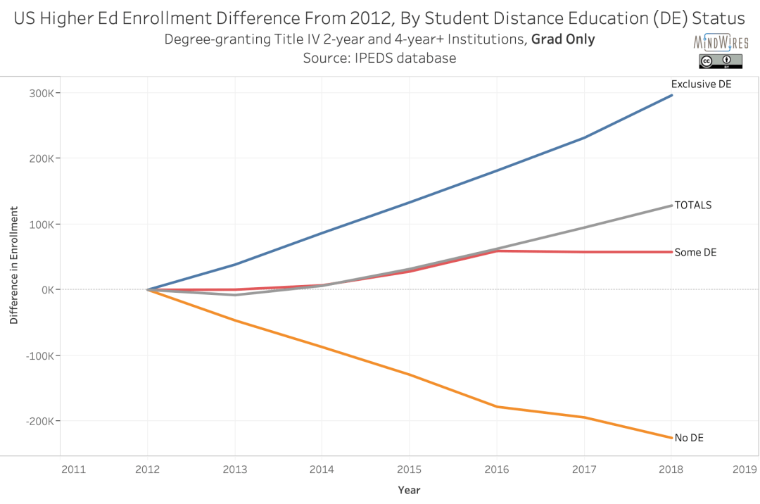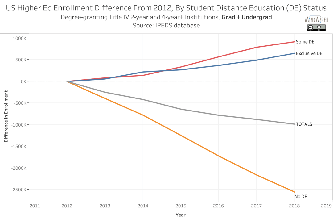 Earlier this week I shared a profile of US online education enrollment based on the new IPEDS Fall 2018 data set. To put the numbers in context, we should look at the trends since IPEDS started tracking online enrollment in Fall 2012.