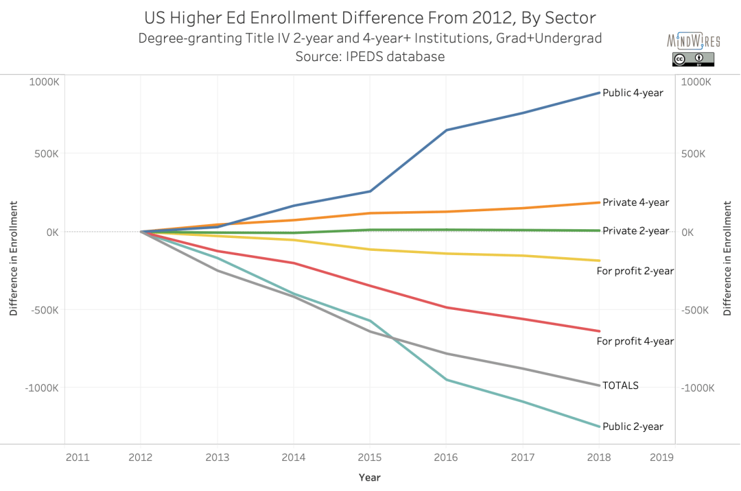 Since the total enrollments are changing, it is worth looking at how the various sectors contribute to these changes by viewing the enrollment differences from 2012 data.