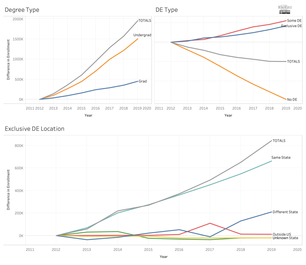 In the view below we combine DE enrollment trends by degree type (for students taking at least one online course), by DE type, and by exclusive DE location.