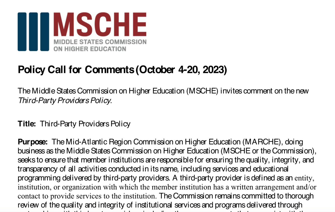 Earlier this month MSCHE released its own guidance on changing definitions of third-party providers (TPP) and third-party servicers (TPS), and it duplicates most of the worst parts of ED’s TPS guidance. The guidance language is so broad that it would force HEIs to disclose almost all EdTech contracts, the public comment process was ridiculously short - possibly going against MSCHE’s own process rules - and it would solve no problem other than share thousands of contracts with MSCHE.